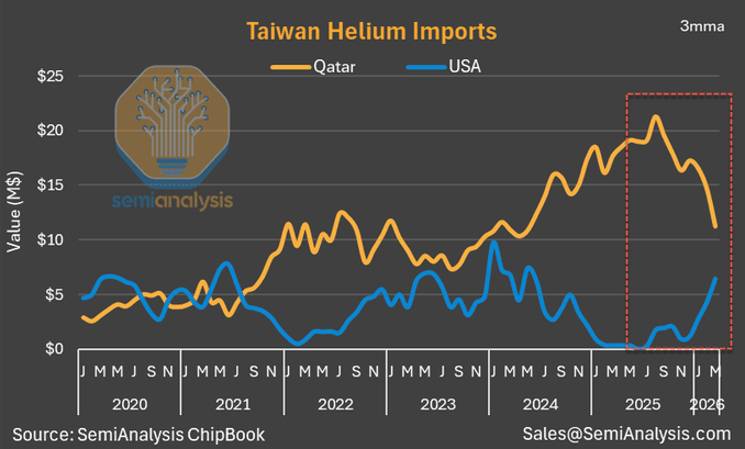 Key points of the SemiAnalysis chart showing the structural shift in Taiwan's helium sourcing:
