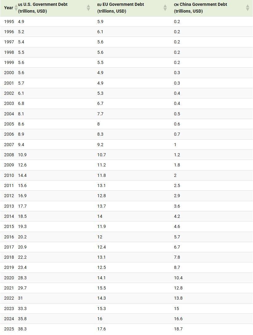The data table below shows the government debt of the U.S., China, and EU from 1995 to 2025 in current U.S. dollars: