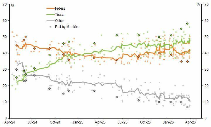 Independent pollsters like Medián consistently show Tisza at 55–58% and Fidesz at 35–38%, with "Other" parties collapsing into single digits.