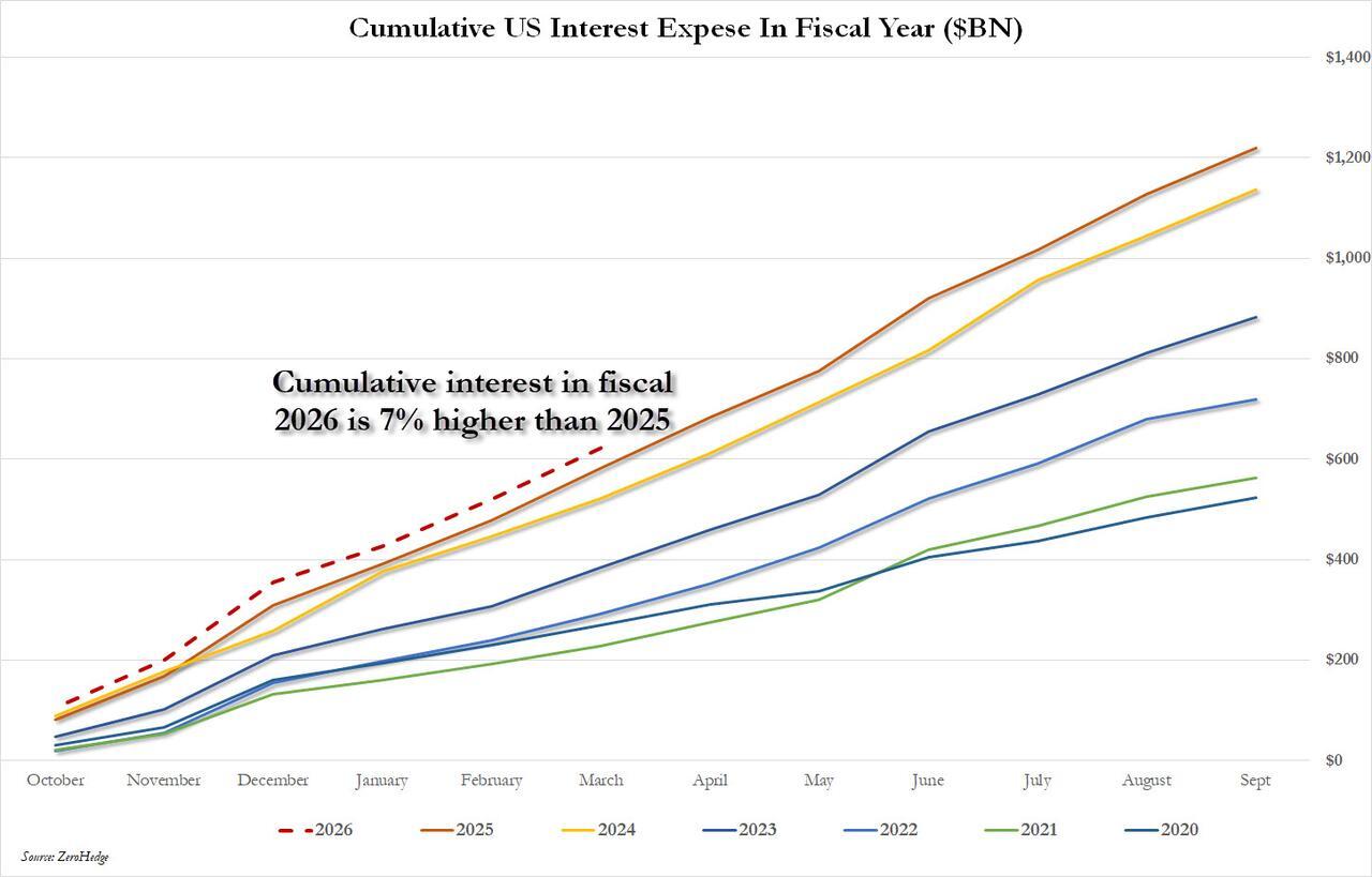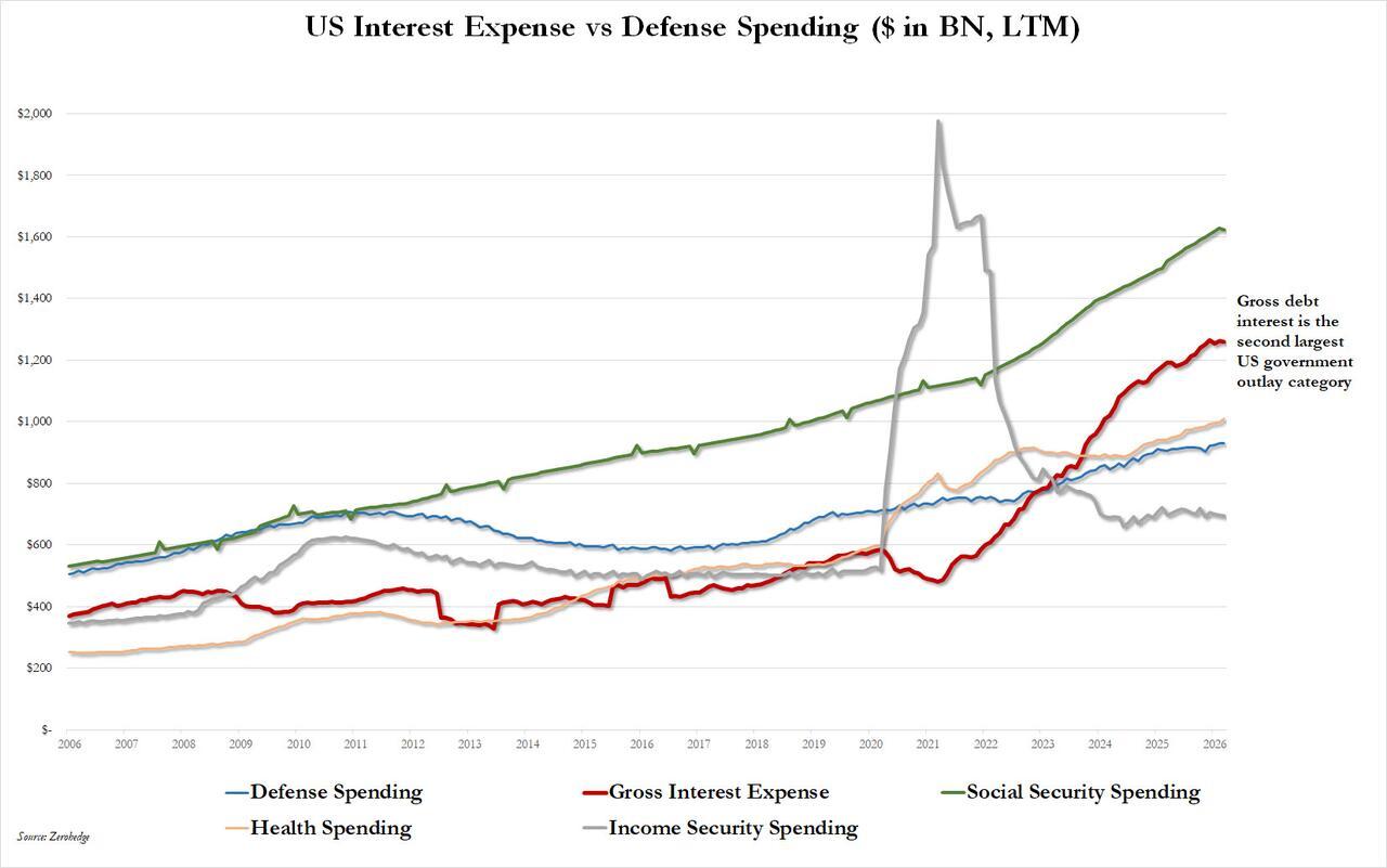 Putting it all together, the big picture emerges, one where outlays on most categories continues to rise - certainly defense, social security and health - but as a result of the drop in rates in the past 1.5 years, the gross interest expense on US debt has been relatively flat in 2026, and in March it was $1.26 trillion, or where it started the year.