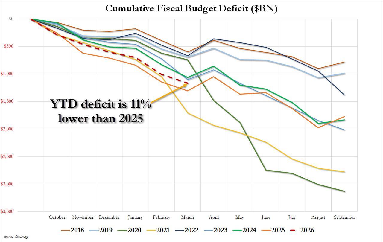 First the good news: The US federal government reported that the March budget deficit rose $4 billion or 2% to $164.1 billion from $160.5 billion a year ago, and higher than the $153.3BN median estimate, as new individual and corporate tax breaks pushed refunds sharply higher, while relief payments to farmers also grew.