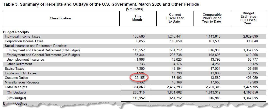 March tax receipts totaled $385 billion, up $17 billion or 4.7% from March 2025...