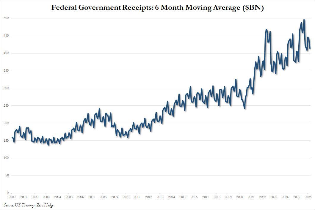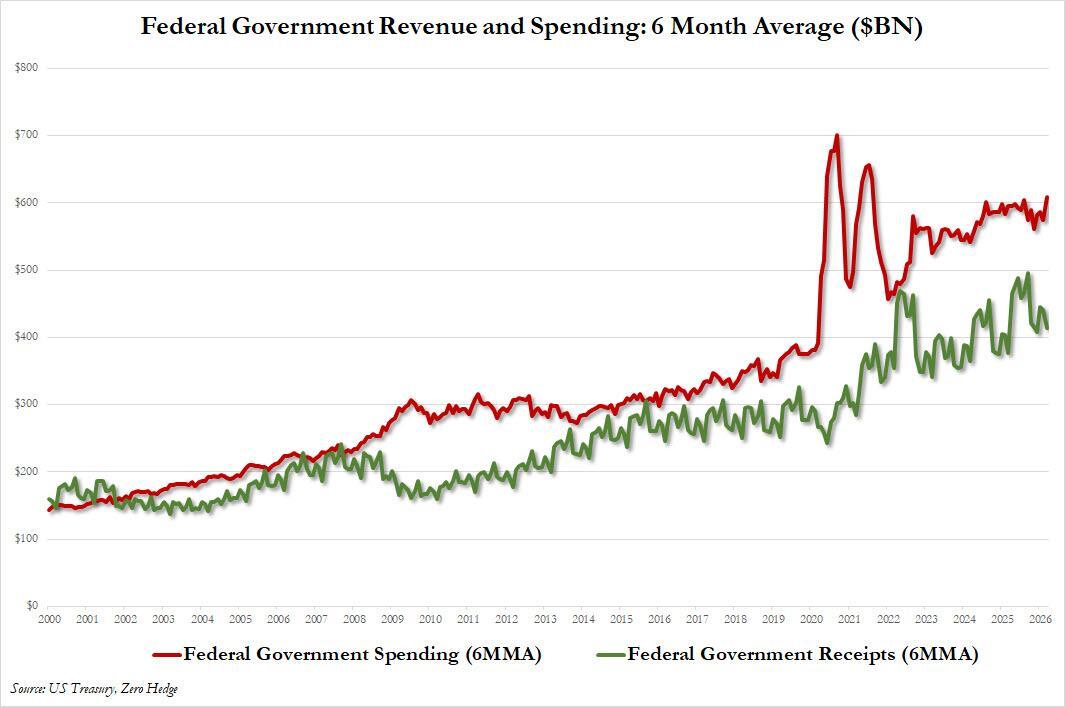 On a cumulative basis, six months into fiscal 2026 (which ends in September), the US budget deficit was $1.169 trillion, down about 11% from the $1.307 trillion accrued through this point in 2025. Aside from the crisis 2021 year, this was the third biggest cumulative budget deficit in US history half-way into the fiscal year.