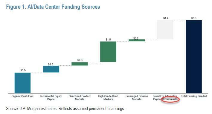 What fewer people know is that this money won't be enough. According to an analysis by JPMorgan, it will take no less than $5 trillion to fund the AI cycle, and even with the massive capex - and debt outlays - the US government will still be on the hook for over a trillion to close the funding gap.