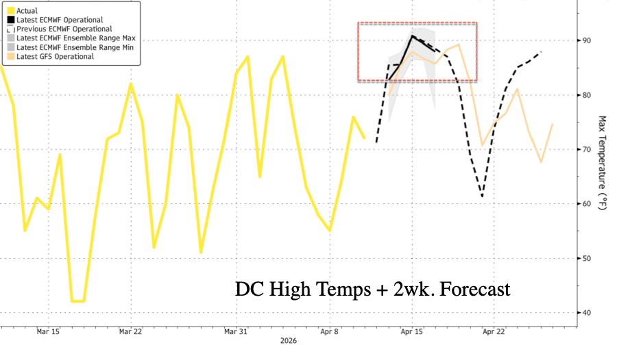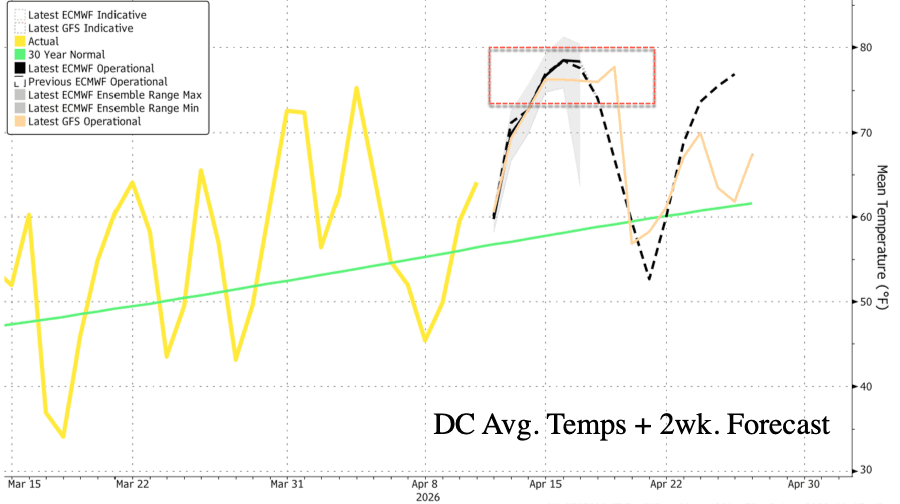 After a stretch of roller-coaster temperature swings across the Mid-Atlantic in March and early April, the midpoint of the month is now shaping up to be unusually warm, with highs that could exceed the region's average for June. That kind of temperature anomaly could prompt left-wing corporate media outlets to kick off their seasonal global-warming doom news cycle as summer approaches.